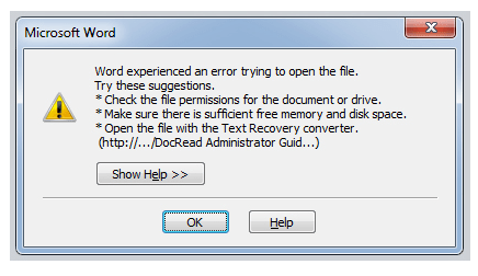 يمكن ان تواجه عند فتح ملف Word 2007/2010 رسالة إعلام بخطا ولا يمكن فتح الملف بالشكل الصحيح كما هو موضح في الصورة التالية, ويكون السبب بالعادة عمليات النقل للملف وبهذه الطريقة لا يمكن فتح الملف .